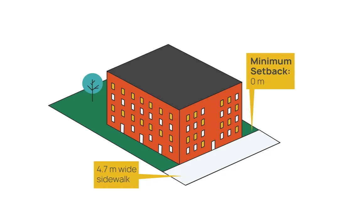 As for the Floor Area Ratio (FAR), the CG zone offers a generous maximum FAR of 3.5, giving you flexibility in how you use your space. In simple terms, if you have a lot that’s 1,600 m², you could build up to 5,600 m² of total floor space. But remember, other factors like height limits and setbacks might restrict your total buildable area, so make sure to plan out and consider your site plan scenarios carefully (or hire us to help you).