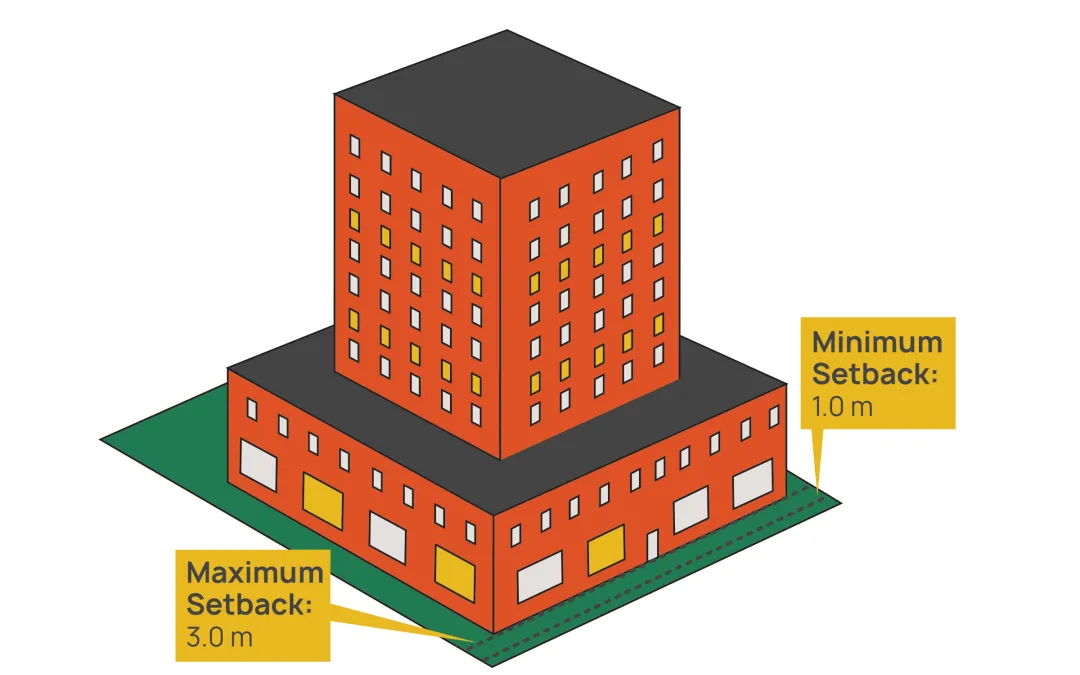 The MU zone uses setbacks to manage building placement and ensure developments are pedestrian-friendly while respecting surrounding properties. Here’s a closer look: