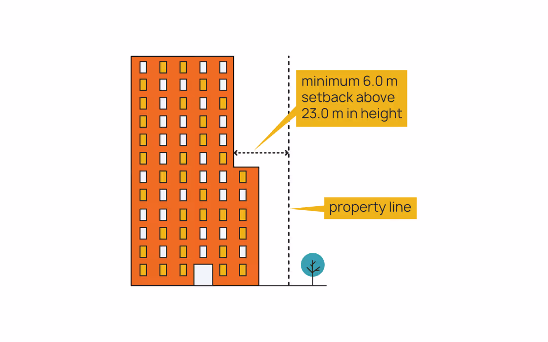 - Portions above 23.0 metres require a 6.0 metre setback from the street.