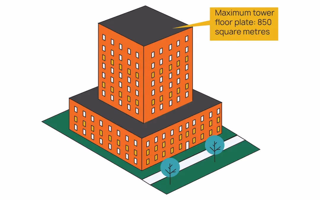 - The maximum floor plate for portions above 23.0 metres is 850 m².