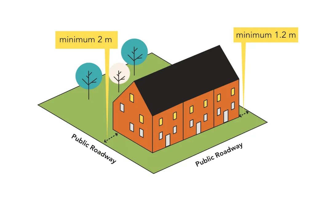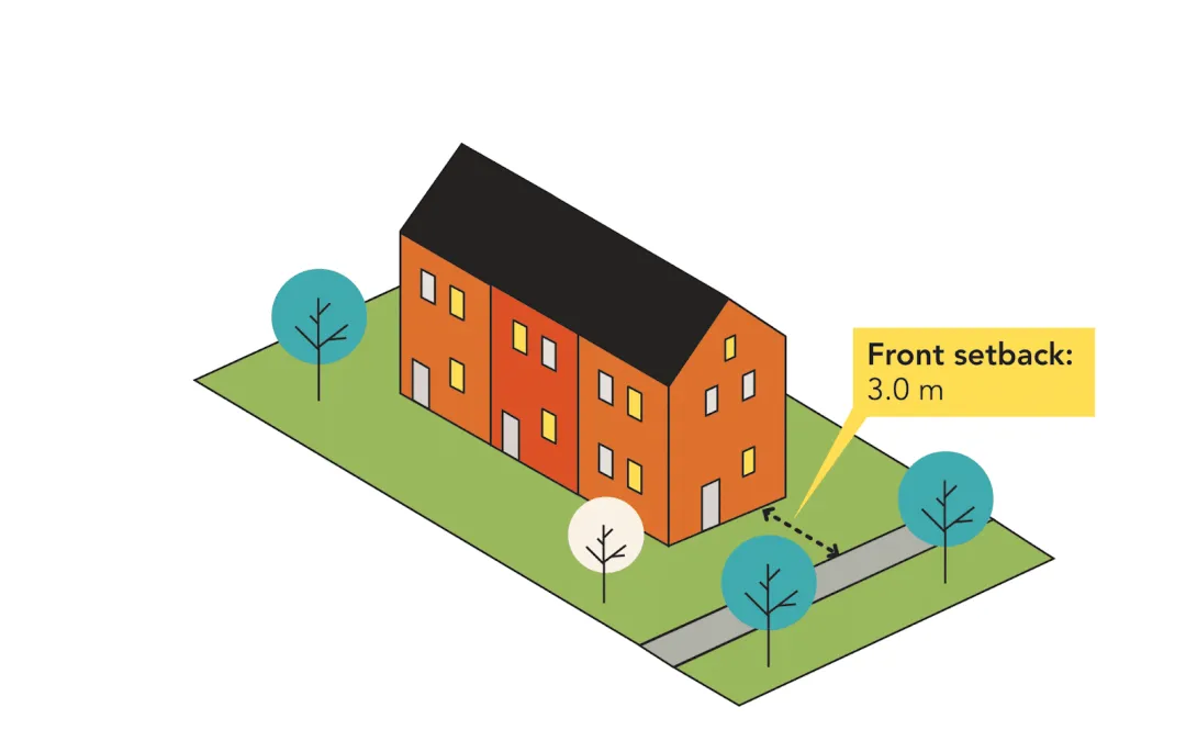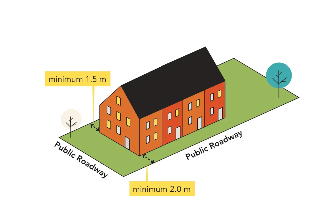 If you’re building multi-unit or row housing and some of the main unit entrances face the side property line, the minimum side setbacks for both sides of the building are increased to 1.5 metres. Again, this is the same as the RS zone.