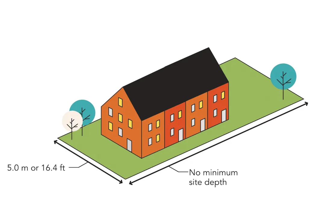 Most zones regulate three main things: lot size, density, and building size. When it comes to lot size, the RSM zone only regulates lot width, which is a minimum of 5.0 meters. There is no minimum lot depth dimension.