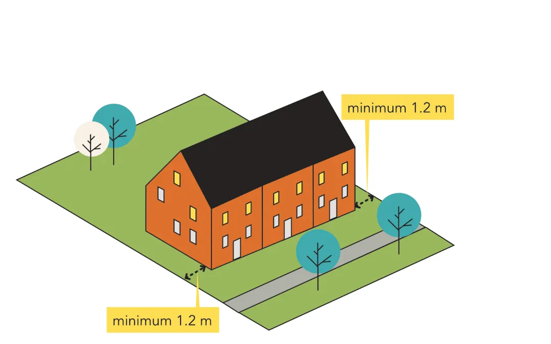 On a non-corner site where all the entrances face the front of the site, the minimum side setbacks are 1.2 metres on each side. This is the same as the RS zone.